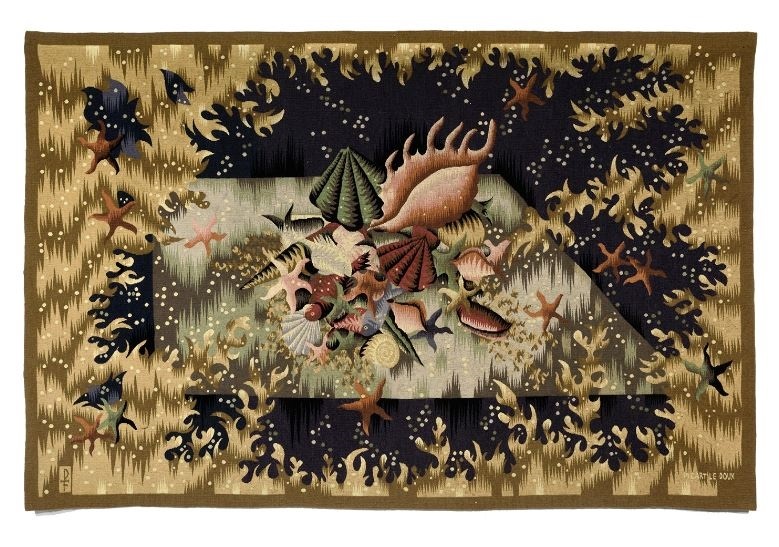 JEAN PICART LE DOUX (1902-1982) & PINTON (MANUFACTURE) Les Petites Algues Tapisserie d’Aubusson basse lisse, tissage en laines polychromes sur chaîne coton, à décor d’une composition de poissons et coquillages, fond d’algues et d’étoiles de mer sur fond ocre et jaune. Signatures dans le tissage de l’artiste et de la manufacture. Bolduc.